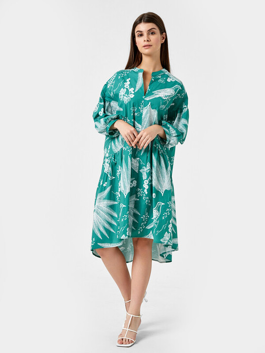 Платье женское свободного силуэта из ткани. Горловина V-образной формы. Стойка отрезная.