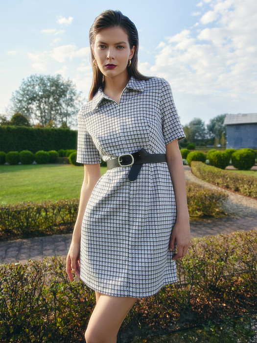 Платье женское полуприлегающего силуэта из трикотажного полотна академик. Горловина круглой формы, в горловину втачан стояче-отложной воротник из основного полотна. Рукав втачной, короткий. Платье отрезное по талии с центральным швом по переду. На верхней детали переда обработана  застежка на потайную молнию в центральном шве. На передних и задних деталях вытачки. Платье длиной мини. Нижний срез платья и рукавов обработан швом вподгибку.