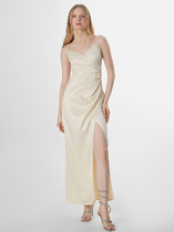 Юбка с высоким разрезом спереди и такими же складками по бокам создает эффект движения и элегантно открывает линию ног. Задняя часть оформлена потайной молнией для безупречной посадки, а регулируемые бретели позволяют точно настроить длину. Глубокий вырез декольте завершает женственный силуэт.