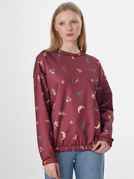 Бордовый свитшот из лимитированной коллекции Mark Formelle x Ольга Бузова с графичным узором игрушек на бордовом фоне станет ярким акцентом в вашем гардеробе. Его свободный силуэт со спущенным плечом и длинными рукавами дарит ощущение расслабленности и повседневного уюта, не ограничивая движений.