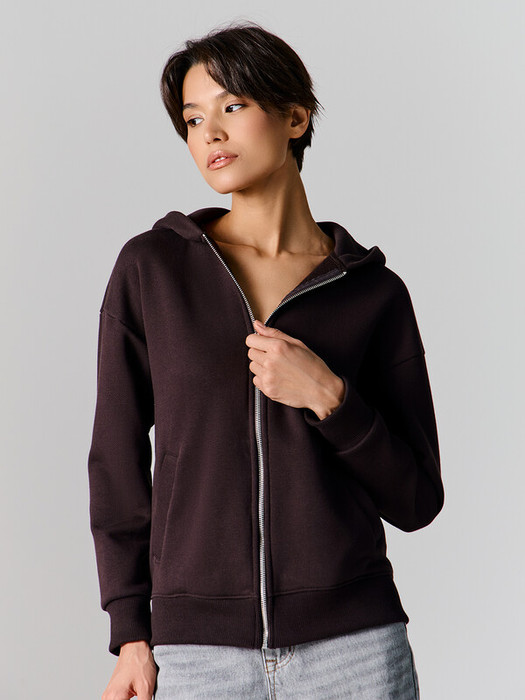 Свободный крой со спущенным плечом и длинными рукавами создаёт расслабленный силуэт. Капюшон, боковые карманы с мягкой подкладкой для хранения мелочей и застежка на молнию, которую можно легко расстегнуть до комфортного уровня, добавляют повседневного удобства и практичности. Эластичные манжеты и пояс из рибаны помогают сохранять тепло и обеспечивают аккуратную посадку.