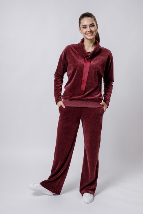 Джемпер свободного кроя, воротник хомут. Декор вышивка на спине. Брюки расклешенные к низу, карманы в боковых швах