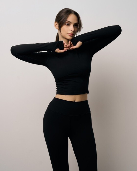 Рашгард спортивный с руковами -реглан  удлиненными и фиксированными на большом пальце.На поолоче и спинке рельефные швы переходяшие на рукова.Полочка отрезная под грудью.
