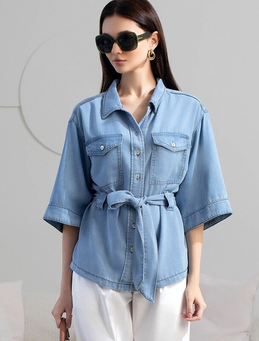 Эффектная удлиненная блузка светло-синего цвета с поясом выполнена из джинсового лиоцелла плотностью 7,8 OZ.. Универсальная модель идеально подходит для повседневной носки, пояс подчеркивает талию и скрывает небольшие недостатки фигуры, сохраняя при этом стильный вид. Отложной воротник создает аккуратный внешний образ, придавая классической рубашке элегантность. На груди расположены карманы, которые добавляют практичности. Ткань сочетает прочность и мягкость лиоцелла с вискозой, что делает её невероятно комфортной, дышащей, устойчивой к сминанию и идеально подходящей для чувствительной кожи. Благодаря нежным тактильным ощущениям, будто шелк, от которого ощущается приятная прохлада, рубашка отлично подходит для создания легких летних образов или стильных ансамблей на каждый день засчет своей универсальности. Широкий рукав средней длины гарантирует свободу движений и удобство на весь день.  Джинсовую блузку можно сочетать в стиле кэжуал, а также создавать монохромные образы или добавлять яркие акценты с помощью