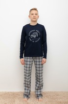 Трикотажный пижамный комплект из натурального хлопка. У джемпера длинные втачные рукава. Брюки с удобным поясом на резинке и утягивающим плетеным шнуром. Оригинальная набивка выполнена из стойких, гипоаллергенных текстильных красителей. Все трикотажные полотна производятся в соответствии с нормами Швейцарского сертификата ЭкоТекс.