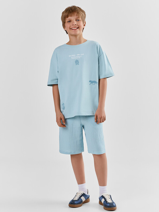 Шорты для мальчиков из ткани (муслин). Шорты с классической линией талии. Силуэт прямой. Пояс цельнокроеный. Верхний срез шорт застрочен с эластичной тесьмой. Карманы в боковых швах (хулиганы). На внешней стороне пояса пробиты петли, втянут шнур из основного полотна. Низ шорт обработан швом в подгибку.