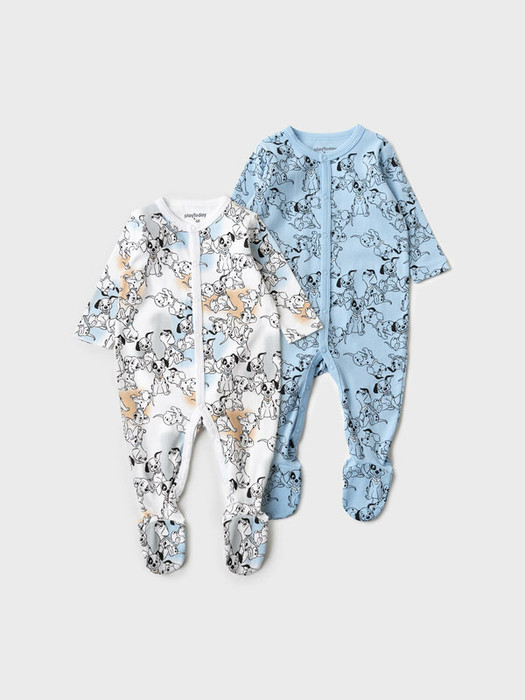 Набор из двух мягких трикотажных комбинезонов с закрытыми ножками для новорождённого мальчика. Один комбинезон — нежно-голубого цвета с принтом в виде весёлых щенков, второй — белый с такими же щенками и пастельными пятнами. У обоих — длинные рукава с отворотами, которые можно использовать как варежки-царапки, и удобная застёжка на кнопках спереди и по низу. Внизу — резиночки на щиколотках для хорошей посадки. 100% хлопковый трикотаж интерлок.