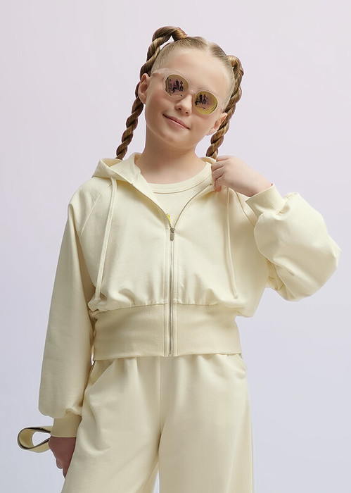 Трендовая укороченая толстовка из футера для прогулок.Застежка молния, капюшон, манжеты из кашкорсе обеспечат удобное использование модели. Сочетай толстовку с джинсами и брюками, создавая стильный образ.