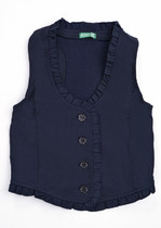 Жилет прилегающего силуэта на пуговицах. Горловина, край борта и низ украшен оборкой. Сзади в рельефных швах хлястик в форме банта.
