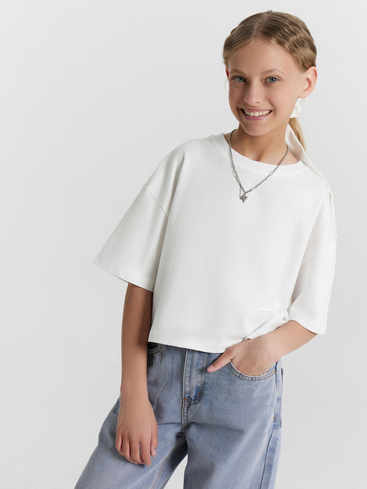 Футболка прямого силуэта укороченная. Перед и спинка цельнокроенные.