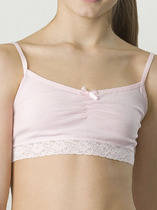 Элегантное бюстье для девочек, изготовленное из эластичного трикотажного полотна и кружева. Чашки на подкладке, стан кружевной. Бретели регулируются сзади и крепятся к детали спинки при помощи колец. Очень комфортная и романтичная модель!