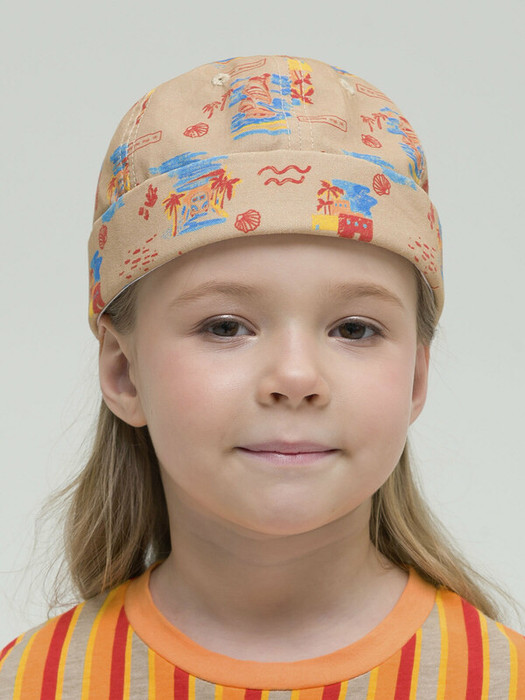 Кепка-докер из 100% хлопка. Натуральный состав ткани делает эту модель дышащей и комфортной для ребёнка. Кепка без козырька — актуальный модный тренд. Сзади застёжка на липу. С её помощью можно регулировать размер. Докер отлично защищает голову от перегрева, при этом не создает тени у глаз и не ограничивает обзор. Имеет отверстия для обеспечения воздухообмена. Расцветка нейтральная – подойдёт и мальчикам, и девочкам. Модель декорирована принтом с летним настроением. Такая кепка прекрасно сочетается с одеждой в стиле оверсайз, в спортивном стиле, джинсами. Идеальна для летнего отдыха, прогулок, походов.