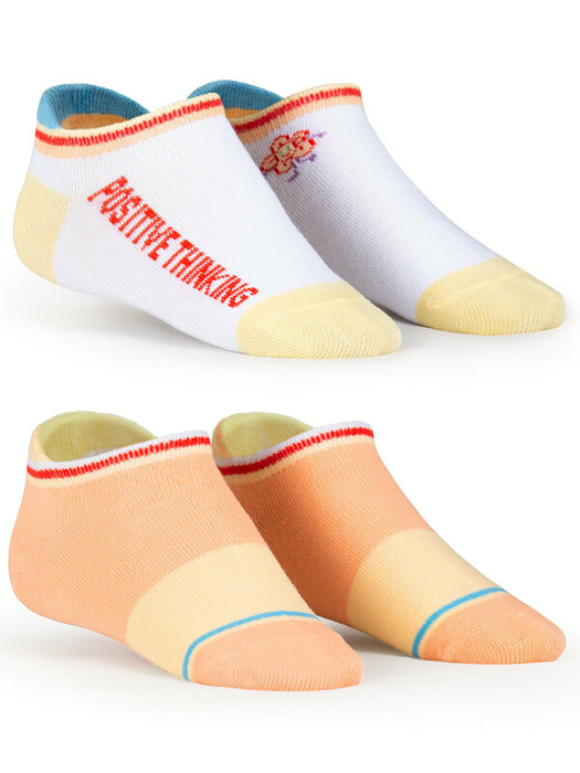 Короткие носки для девочки, упаковка из 2-х пар.  Носки с высоким содержанием хлопка и добавлением эластана не спадают, не садятся, не теряют форму. Не сползают с ног, с мягкой нетугой резинкой, которая не сдавливает ногу. Носочки подойдут к любой одежде для детей. Два веселых человечка и текстовый принт "позитивное мышление" не дадут заскучать вашему ребенку.