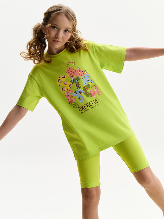 Детский пижамный костюм двойка - это удлиненная футболка с коротким рукавом и удобные велосипедки, выполненные из натуральных материалов. Пижама для девочки изготовлена из 100% хлопка. Футболка умеренного объема, плечо немного спущено, рукава широкие. Широкая и мягкая резинка в поясе велосипедок не перекручивается и не давит. Отделка горловины из эластичной рибаны — она не растягивается, ребёнку удобно надевать и снимать пижаму. Перевод принта: "УПРАЖНЕНИЕ на РАСТЯЖКУ - лучший способ начать день"