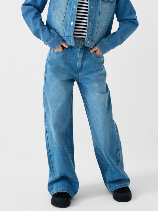 Джинсы прямые для девочки подростка. Модель свободного кроя с широкой штаниной и классической посадкой на талии. По переду расположены два стандартных кармана и маленький дополнительный карман, сзади — два накладных. В поясе предусмотрена регулировка объема за счёт резинки с пуговицами. Джинсы застёгиваются на молнию и болт.