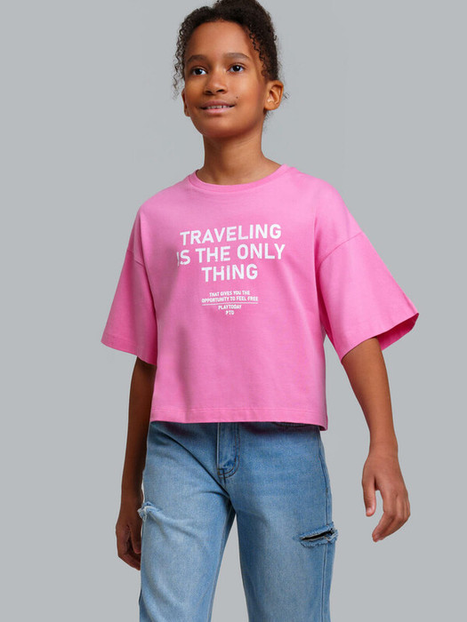Укороченная футболка оверсайз для девочки подростка. Высокое содержание хлопка. Благодаря наличию эластана в составе ткани изделие держит форму и меньше мнется.  Модель выполнена из качественного и приятного на ощупь трикотажа.