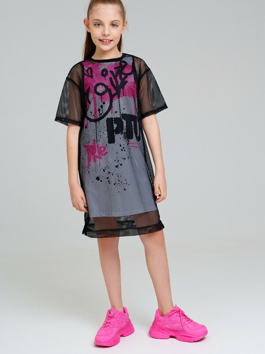 Комплект для девочки подростка. Платье из эластичного и приятного на ощупь трикотажа джерси. Высокое содержание хлопка 95%. Благодаря наличию эластана в составе ткани изделие держит форму и меньше мнется. Туника из сетки. Модель выполнена из качественного и приятного на ощупь трикотажа.