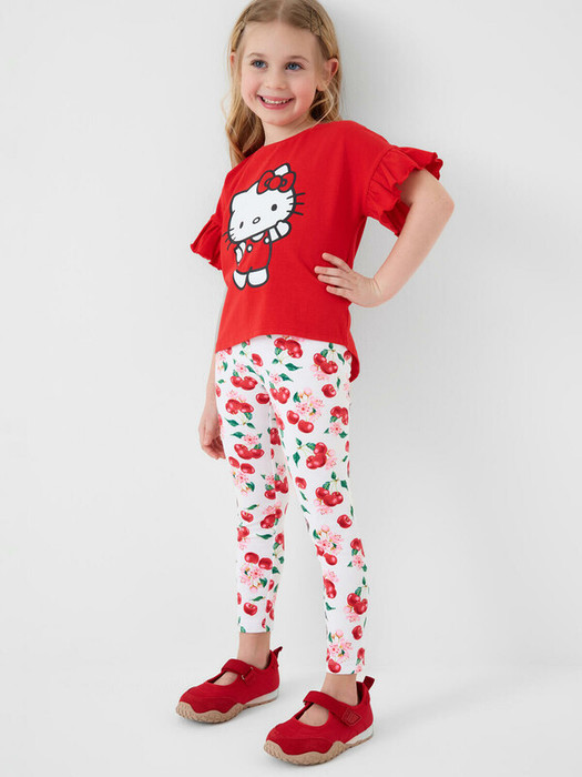 Детский комплект для девочки. Включает тунику и легинсы, выполненные из мягкого хлопкового трикотажа джерси. Туника красного цвета с принтом любимого мультяшного персонажа "Hello Kitty" на груди, с рукавами-фонариками, добавляющими легкости в образ. Легинсы на резинке белого цвета с ярким вишневым принтом.