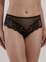 Трусы-шорты женские из эластичной сетки. По переду вставка из хлопкового полотна. Обработка краев по талии - ажурной резинкой с фестоном, по ноге - узкое кружево.
