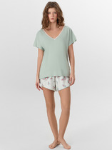 Халат прямого силуэта, длина выше колена. Спинка цельнокроеная. На уровень талии в боковой шов настрочены завязки из тесьмы. Концы тесьмы завязываются. Обтачной пояс заправлен в шлевки на боковых швах, на уровне талии. По переду настрочены накладные карманы с закруглением по низу. Верхний срез карманов застрочен. Рукава втачные, длинные. По краю борта проложена отделочная строчка. Посередине горловины спинки настрочена фирменная вешалка.