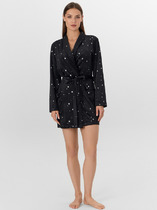 Особый шарм халату придают завязки из тесьмы на уровне талии и декоративный пояс, продетый в шлевки. Практичные накладные карманы с закругленным низом дополняют образ. Звездный узор и глубокий черный цвет делают эту модель стильным элементом домашнего гардероба, который подарит ощущение комфорта в течение вечера.