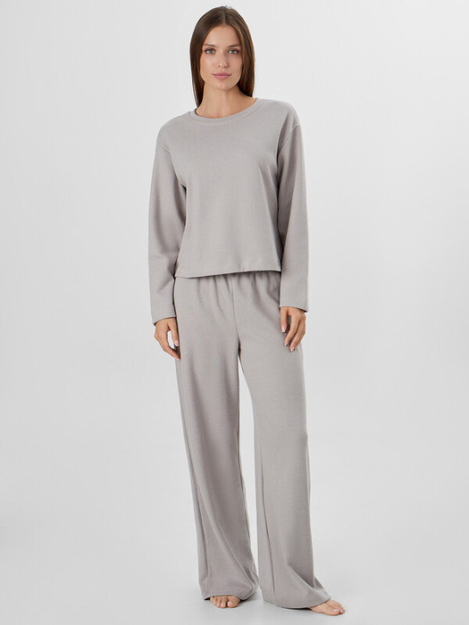 Комплект женский состоит из джемпера (502872) и брюк (532253). Джемпер домашний женский прямого силуэта. Горловина круглой формы, обтачка из основного полотна. Плечо слегка спущено. Рукав втачной, длинный. Нижний срез джемпера обработан швом вподгибку. Брюки с посадкой на талии, свободного силуэта. Пояс цельнокроеный с эластичной тесьмой внутри (внутр. 40мм 40RV). Нижний срез обработан швом в подгибку.