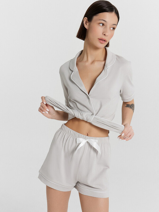 Хлопковый женский комплект актуального свободного силуэта. Рубашка прямая, с отложным воротником и лацканами, короткими рукавами, застегивается на пуговицы. Дополняют ее свободные шорты длины мини, с резиновой тесьмой в поясе и атласной тесьмой, которая завязывается на бантик. Особенность модели – контрастные канты на рукавах, воротнике и  передней части рубашки. Рекомендуем для сна, отдыха и домашних дел!
