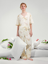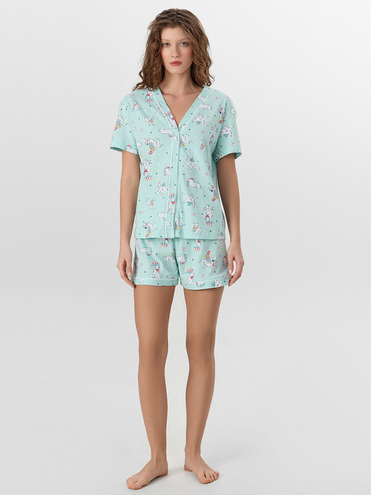 Рубашка с отложным воротником и короткими рукавами застегивается на аккуратные пуговицы. Свободные шорты с эластичным поясом бережно облегают талию, не стесняя движений во время отдыха или домашних дел.