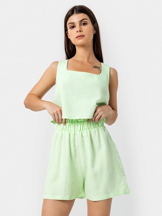 Стильный топ на широких бретелях. Выполнен из премиального льна и нежной легкой вискозы. Силуэт прямой, длина до линии талии. Вырез декольте достаточно глубокий, формы "каре". На спинке есть петелька-вешалка. Рекомендуем для стильных летних образов!