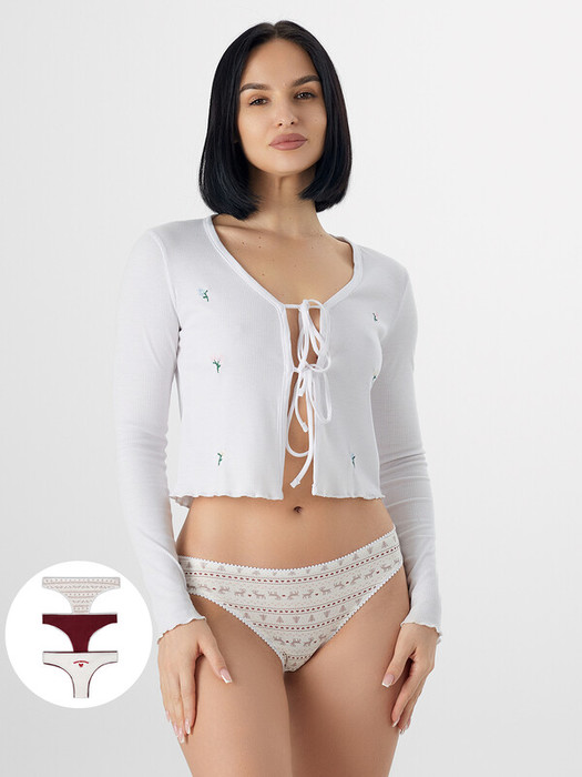 Хлопковые трусики-бразилиана из натурального, гипоаллергенного, дышащего полотна. Линия талии слегка занижена. На верхнем срезе – тонкая эластичная тесьма, по ножкам – шов вподгибку. Продаются в мультипаке по 3 штуки!