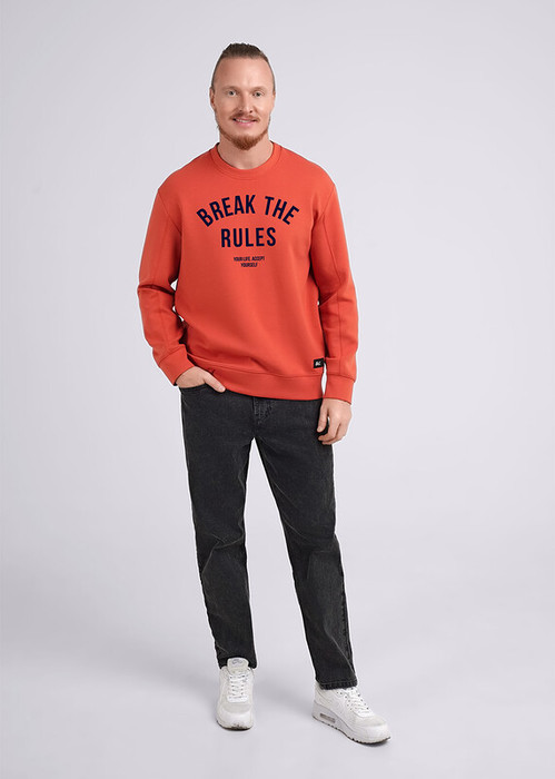 Стильный мужской джемпер из хлопкового трикотажного полотна. Изделие с круглым вырезом горловины и длинным двухшовным рукавом на манжете. Модель дополняется дизайнерским шрифтовым принтом и фурнитурой.Отличный вариант на каждый день и встреч с друзьями.