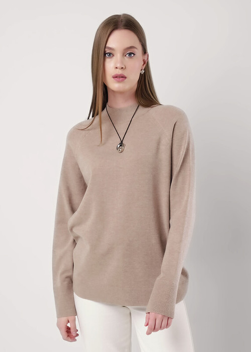 Вязаный джемпер свободного силуэта из вискозной пряжи, переплетения гладь. Длинный рукав реглан. Округлая горловина стойка без загиба. По низу изделия и рукавов манжеты. Спереди нашивка металл.