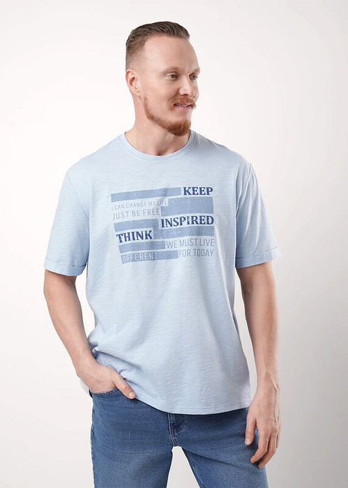 Футболка мужская с круглым вырезом горловины и коротким втачным рукавом из фактурного полотна флам. Футболку дополняет шрифтовой принт. Подойдет для прогулок и встреч с друзьями.