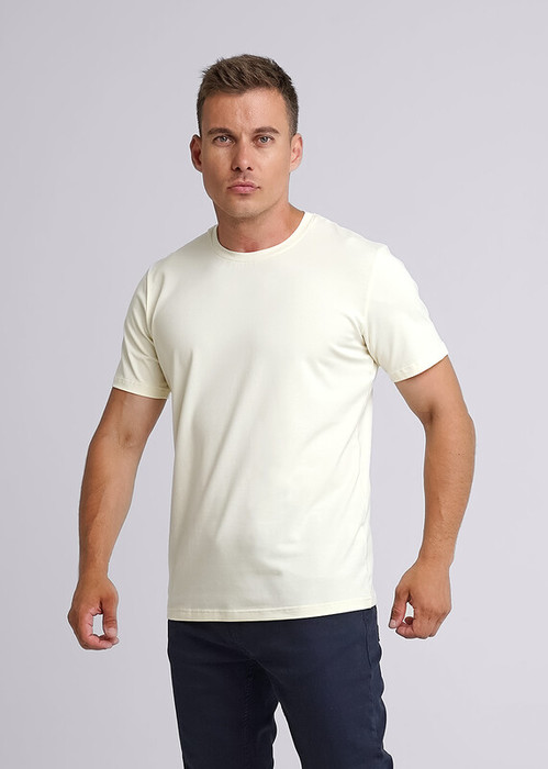 Базовая однотонная футболка стандартного объема с круглой горловиной, втачным рукавом из хлопкового полотна с добавлением эластана. Является неотъемлемой частью мужского гардероба.