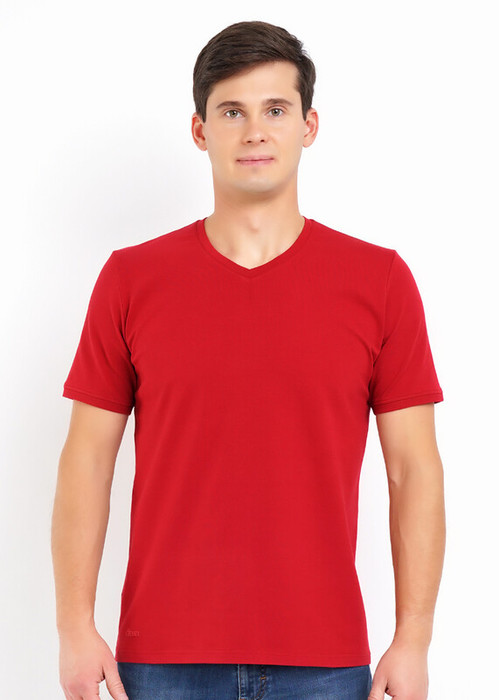 Базовая однотонная футболка стандартного объема с V вырезом горловины, втачным рукавом из хлопкового полотна с добавлением эластана. Является неотъемлемой частью мужского гардероба.