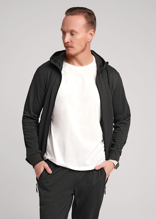Куртка мужская с застежкой-молнией по переду на капюшоне из плотного пике. Рукава втачные с манжетой, по низу пояс. На капюшоне люверсы со шнуром и наконечниками. Для функциональности и удобства спереди карманы на молнии с тесьмой.