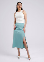 Юбка миди прямого силуэта из вискозного трикотажного полотна. По талии притачной пояс на внутренней резинке, спереди нашивка. По переду и спинке средний шов. Сзади разрез.