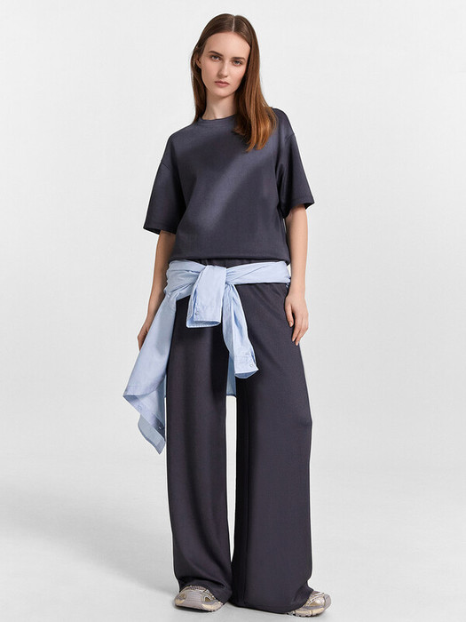 Брюки свободного силуэта, немного расширяются к низу. Пояс отрезной, с эластичной тесьмой внутри. По поясу проложены отделочные строчки.