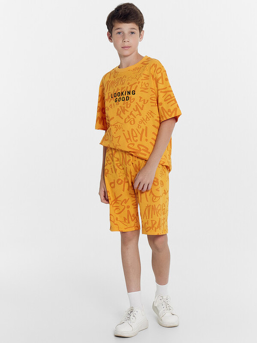 Стильный комплект для мальчиков. Изготовлен из трикотажного футера. Футболка свободного силуэта, длиной до середины бедер, с короткими рукавами и круглой горловиной. Шорты длиной до колена, с эластичной резиной в поясе  и регулировочным шнурком. Отличный выбор!