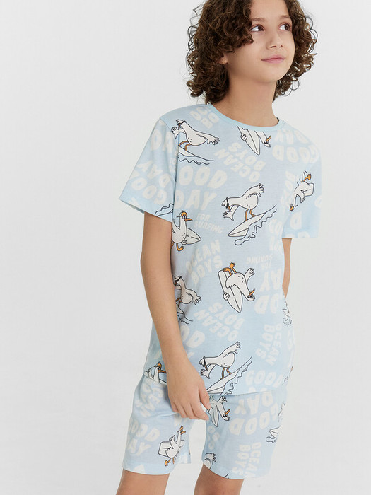 Пижама для мальчиков. Выполнена из хлопкового трикотажа кулирного переплетения. Комплект включает футболку и шорты. Футболка свободная, с круглой горловиной и короткими рукавами. Шорты длиной до колен, с эластичной тесьмой в поясе. Отличный комплект для сна и отдыха!