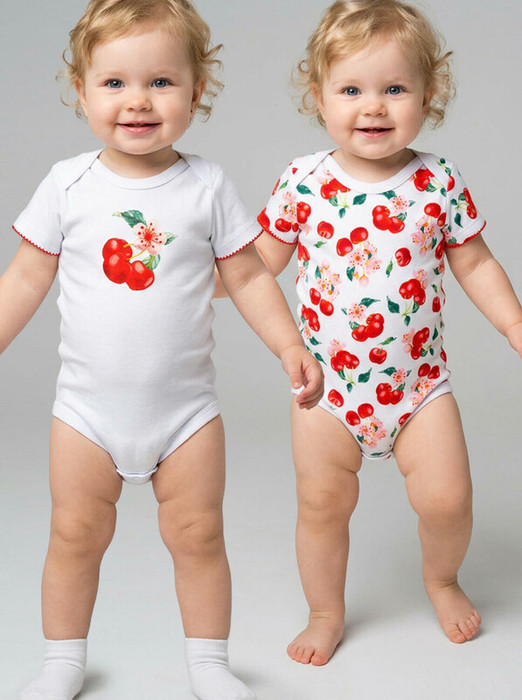 Комплект из двух детских боди с коротким рукавом девочки. Один боди украшен ярким принтом с вишнями и цветами по всей поверхности, второй — лаконичный, с небольшим изображением вишни на груди. Оба изделия белого цвета. Удобная круглая горловина с запашным плечом облегчает переодевание. Застежка на два ряда кнопок внизу помогает быстро сменить подгузник. Выполнены из мягкого хлопкового трикотажа.