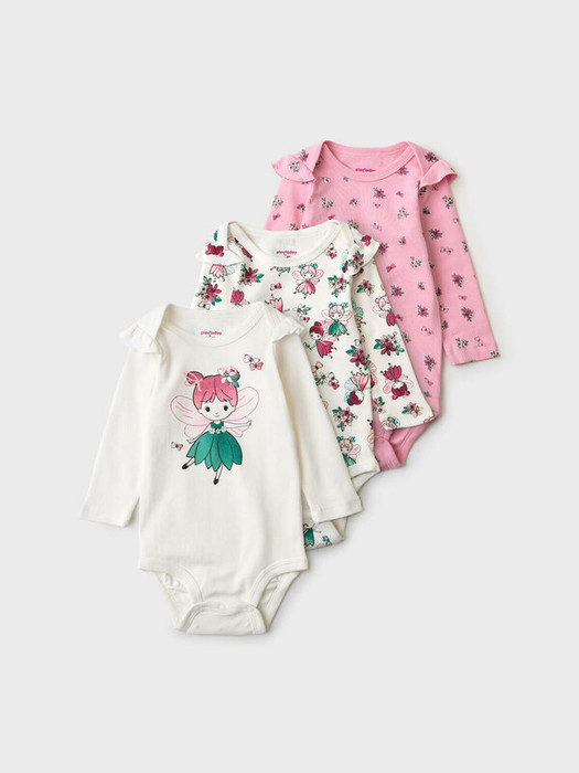 Комплект из трёх боди для новорождённой девочки. Все изделия выполнены из мягкой хлопковой ткани, с длинными рукавами и удобной застёжкой на кнопки снизу. Два ряда кнопок, боди растет вместе с малышом. У каждого боди — милые рюши на плечах и разный дизайн: одно с крупным принтом феи, второе — с принтом фей и цветов, третье — розовое с мелким цветочным рисунком.