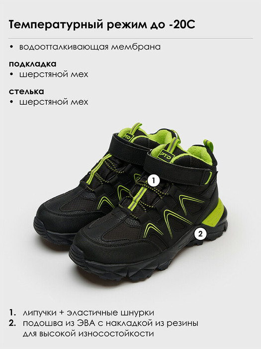Ботинки зимние с мембраной для мальчика подростка. Конструкция верха изготовлена с использованием мембранных технологий. Верх обуви имеет водоотталкивающее покрытие. Усиленная защита носочной и пяточной  части специальными материалами. Удобная застежка-липучка и эластичный шнурок. Модель имеет светоотражающие элементы.  Подкладка и стелька выполнены из шерстяного меха 80%. Съемная стелька. Формоустойчивый задник поддерживает стопу в правильном положении. Подошва из облегченного и гибкого ЭВА имеет дополнительные вставки из терморезины с хорошими противоскользящими свойствами. Рекомендованный температурный режим ( зависит от активности ребенка и поддевы под обувь) от 0°С до -20°С.  Модель из капсульной коллекции DIGITAL TRANSFORM (ДИДЖИТАЛ ТРАНСФОРМ). Соберите полный образ в едином стиле!