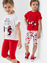 Набор детских легинсов для девочки. Комплект состоит из двух пар укороченных легинсов. Первая пара выполнена в классическом красном цвете, вторая — с ярким принтом вишен, листьев и цветов. Леггинсы украшены декоративными бантиками. Обе модели имеют высокую посадку и эластичный пояс, который хорошо фиксирует изделие на талии. Материал - мягкий, хлопковый трикотаж.