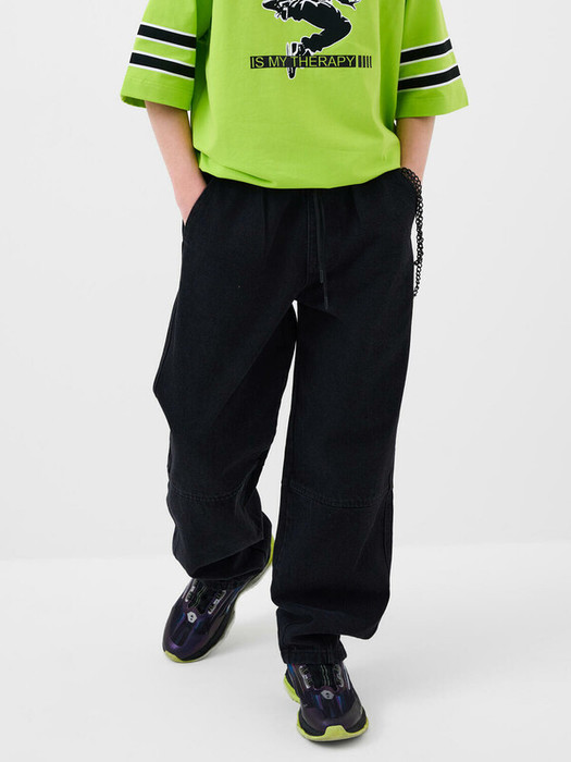 Свободные подростковые джинсы с модным объемным силуэтом balloon для мальчика подростка. Брюки выполнены из плотного денима. Пояс на широкой резинке и дополнен шнуром для регулировки. Спереди расположены удобные карманы, сзади — два кармана с клапанами на липучке. На одном из задних карманов — декоративная нашивка с надписью. На одной из штанин нанесён вертикальный принт с мотивационной фразой. Главный акцент — это металлический карабин с декоративной цепочкой и подвесками, который крепится у пояса и придаёт образу характер и индивидуальность.