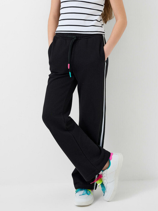 Брюки клеш для девочки подростка. Выполнены из хлопкового трикотажа футер без начеса. Высокая посадка на талии. Пояс на резинке со шнурком, для регулировки посадки. Удобные боковые карманы. По бокам декоративные лампасы.