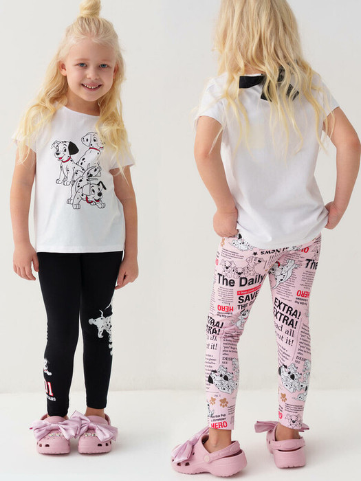 Набор детских легинсов для девочки. Комплект состоит из двух пар длинных легинсов. Принт с героями любимого мультфильма "101 далматинец". Обе модели имеют высокую посадку и эластичный пояс, который хорошо фиксирует изделие на талии. Материал - мягкий, хлопковый трикотаж.