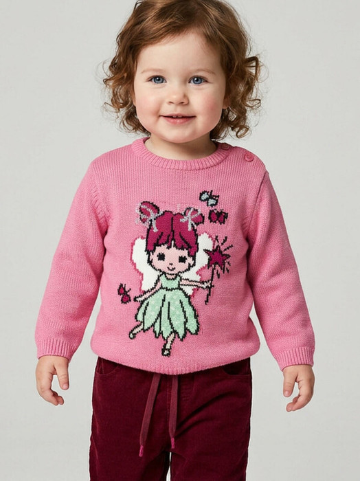 Детский джемпер для девочки. Модель из мягкого, хлопкового трикотажа. На груди расположен крупный жаккардовый рисунок с изображением феи, бабочек и волшебной палочки. В волосах феи и на палочке добавлены блестящие элементы из люрекса. Рукава длинные, с мягкими манжетами. Круглая горловина и низ также обработаны эластичной трикотажной резинкой. На плече предусмотрены кнопки для удобства надевания.
