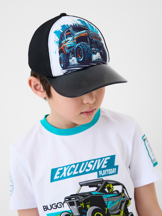 Стильная бейсболка для мальчика подростка. Модель с ярким принтом — спереди изображён внедорожник. Передняя часть выполнена из плотной хлопковой ткани с цветной печатью, а боковые и задние панели — из черной сетки для вентиляции. Жесткий прямой козырек окрашен с градиентом от черного к бирюзовому. Сзади — удобная застежка на липучке для регулировки размера.