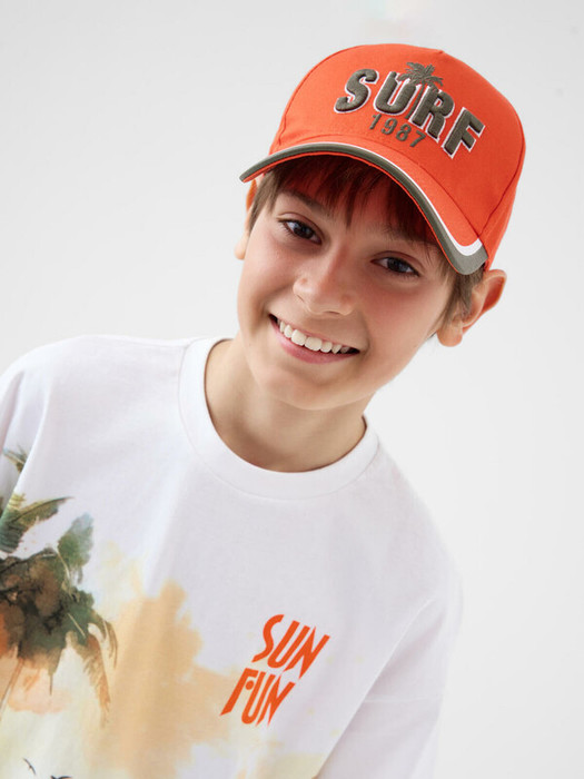 Бейсболка для мальчика подростка. Выполнена в ярком оранжевом цвете с жёстким изогнутым козырьком и контрастной отделкой по краю. Спереди — крупная вышивка, изображением пальмы. Сзади есть регулируемая застежка с металлической пряжкой. Вентиляционные отверстия.